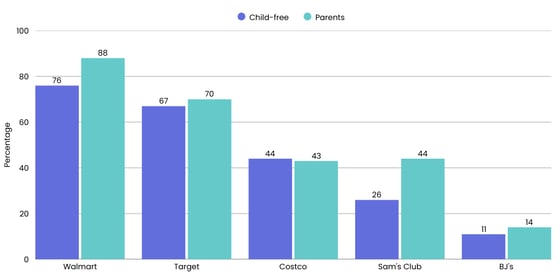 Millennials also differ slightly on their Big Box store preferences. While Millennials of all parenthood statuses rate Walmart in first place (88% for parents, 76% for the child-free), parents apparently have a penchant for Sam's Club (and to a lesser extent, BJ's).