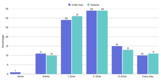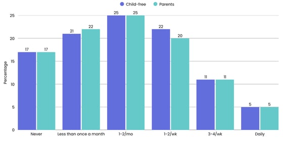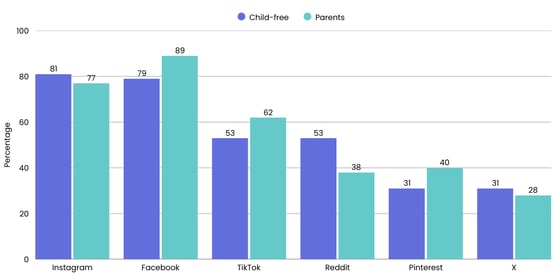 For parents, Facebook is the big winner (89% are users), while the child-free prefer Instagram slightly (81% are users). Parents are also more likely to use TikTok (62% for parents, 53% for the child-free) and Pinterest (40% for parents, 31% for the child-free), while you're more likely to find the child-free on Reddit (53% versus 38%).