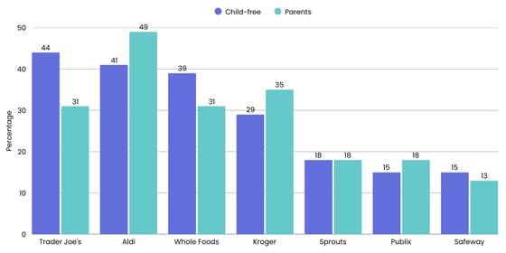 For the child-free, Trader Joe's is a favorite (44%), while the parenting Millennials are opting for Aldi (49%).